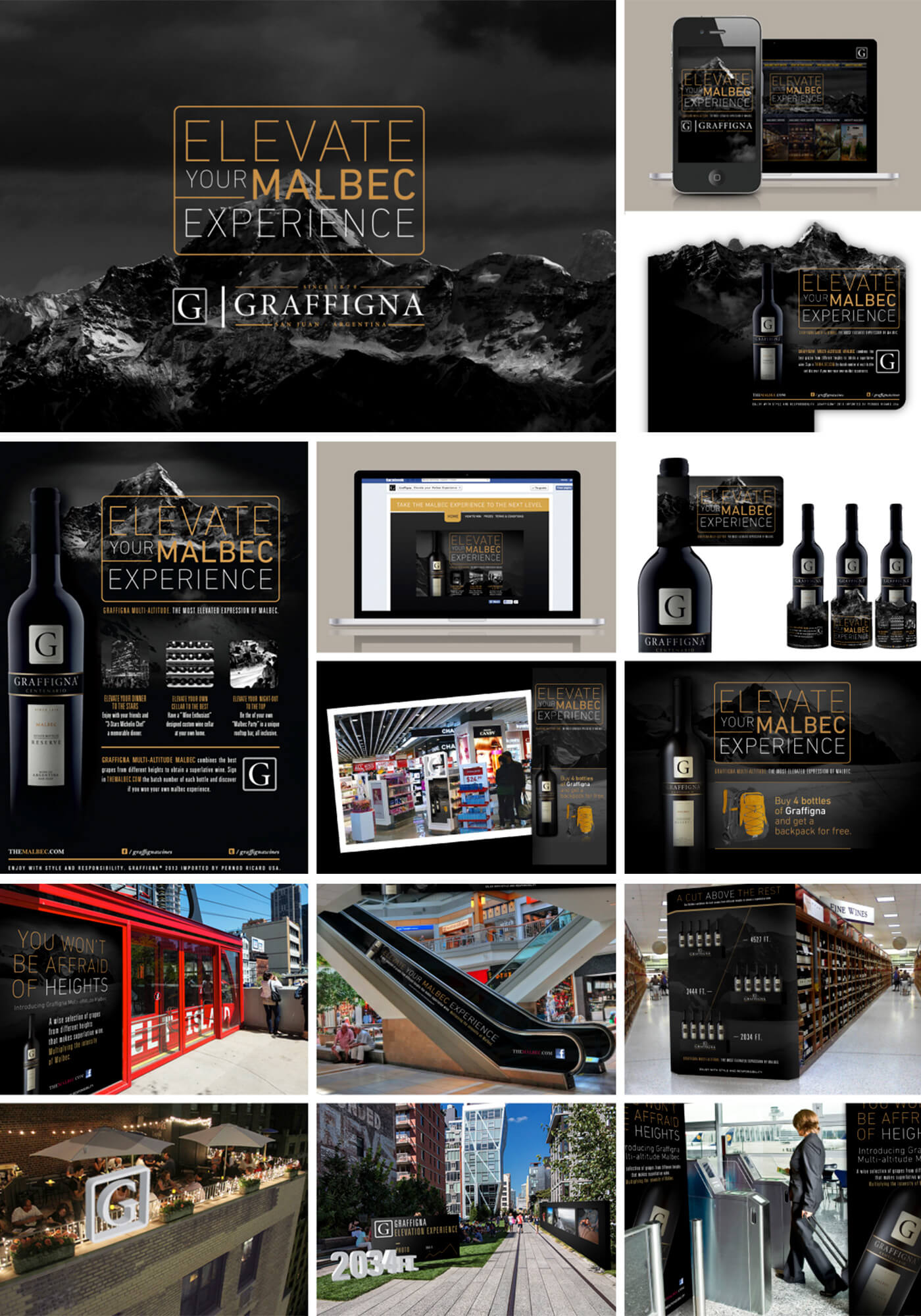 Para bodegas Graffigna desarrollamos la identidad, plataforma de marca y campaña de comunicación, incluyendo los nuevos lanzamientos de productos innovadores como el Malbec multialtitud, un blend entre viñedos de diferentes altitudes en la Cordillera de los Andes. La campaña fue desarrollada en USA, Canadá y Norte de Europa, utilizando publicidad convencional, acciones de trade marketing, digital e intervenciones urbanas.